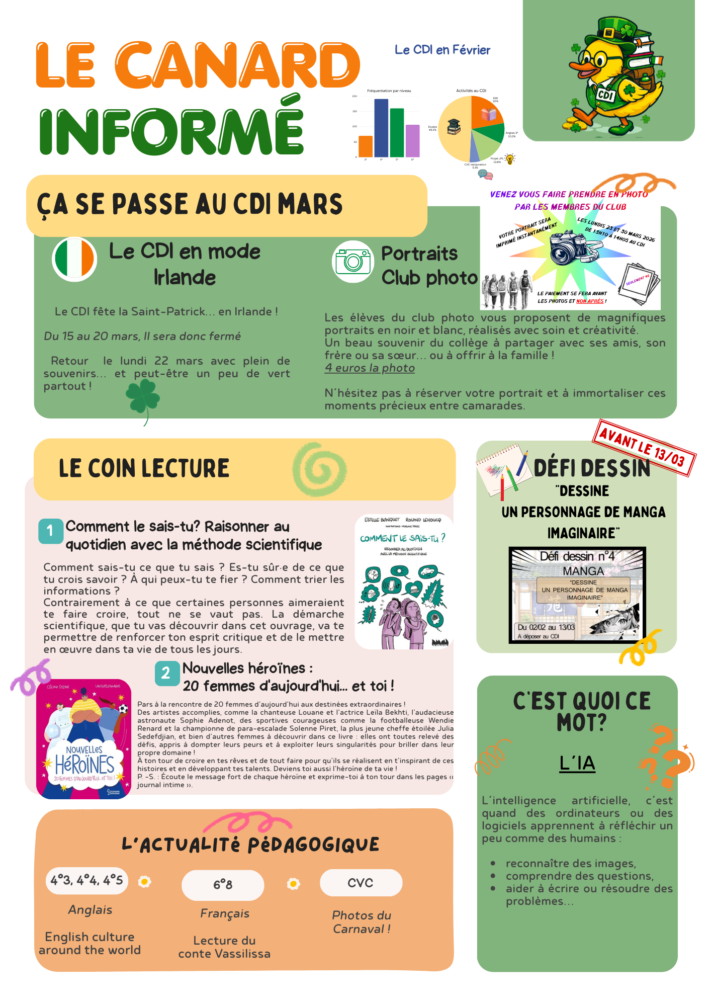 | Le C.D.I. est un espace de lecture, de recherche documentaire et d'ouverture culturelle. Les élèves peuvent y venir pendant leurs heures d'étude. L'inscription se fait directement au CDI. - Horaires d'ouverture du CDI : un planning est affiché le lundi matin et précise les heures d'occupation du CDI. - Le catalogue du CDI (Logiciel PMB): pour des recherches par mots clés, titre et auteur. - Le prêt des documents : Tous les documents peuvent être empruntés à l'exception des derniers numéros de magazines et des bandes dessinées peuvent être empruntés. Le prêt des documents est fixé à : 3 livres par élève : pour une durée de 3 semaines une revue pour une durée d' une semaine. |